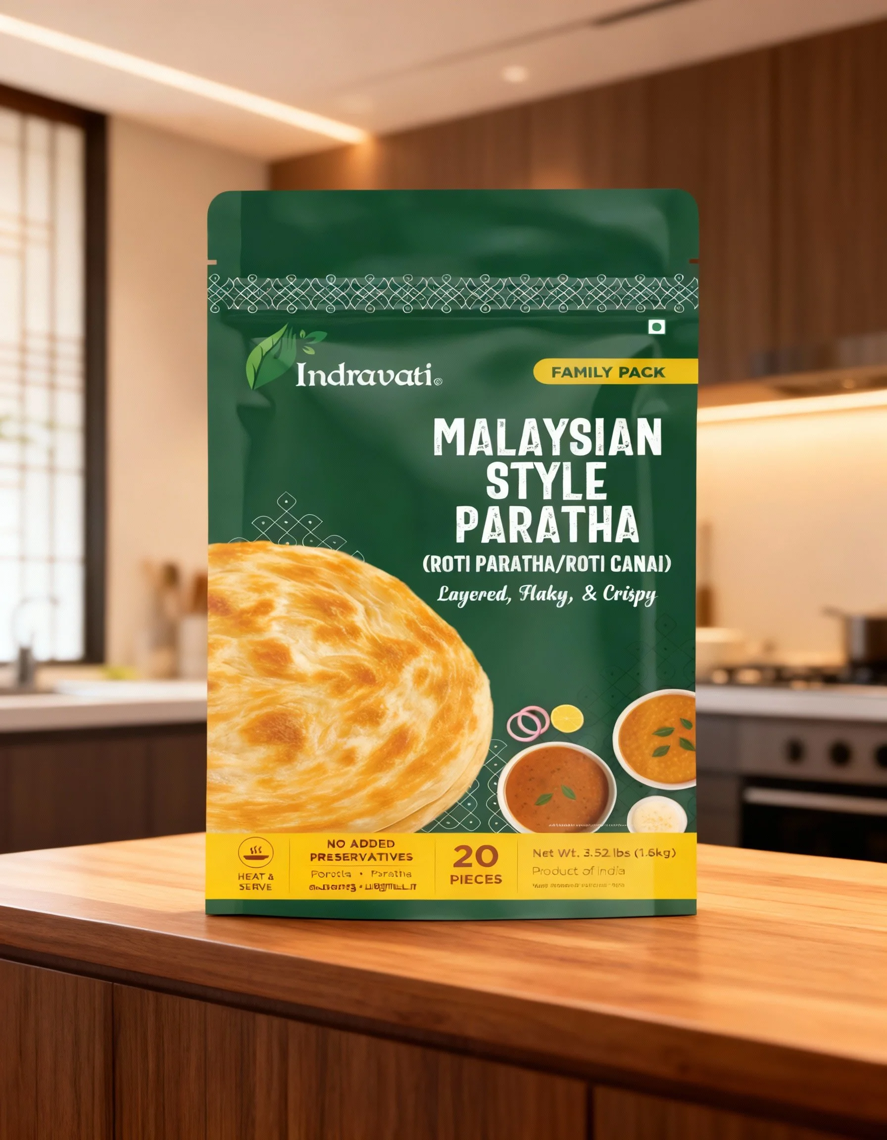 Layered, Flaky, & Crispy. Dipping Perfection. Pure Tradition for Your Sacred Moments. This popular flatbread, also known as Roti Paratha/Roti Canai, offers a beautiful Layered, Flaky, & Crispy texture. It's the perfect size and thickness for tearing and dipping into both savoury curries or even sweet condensed milk for an authentic Malaysian experience. Heat & Serve.